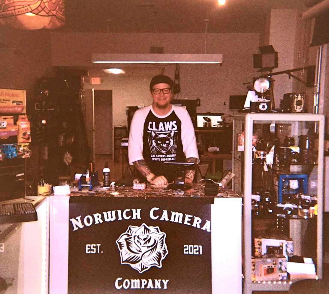 The eccentric camera store, which could be mistaken for a record shop, sits on Franklin Street in Norwich. A skeleton surrounded by camera paraphernalia, welcomes customers, as does the very much alive part-owner, Andy Pigg. A collection of traditional-style tattoos, including a large Darth Vader piece visible under the sleeves of his cat lovers against white supremacy shirt, and two colored portraits on the tops of his hands. He wears a black cap that sits atop his head, above his dark-rimmed glasses. He stands behind a glass case holding a variety of cameras, accessories, and film. There are Nikon, Canon, and indie brands you have never heard of lining the shelves. A wide variety of film options are spread out above the lenses for sale. Hanging on the wall are rows upon rows of film options and even more cameras hang from a refurbished pallet.