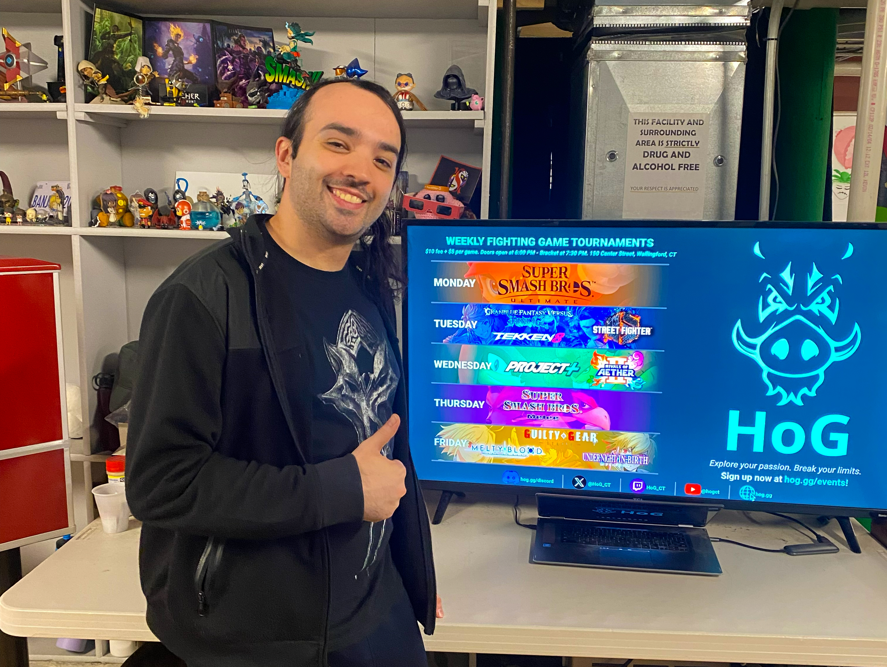 Nestled in the heart of Wallingford, Connecticut, by the intersection of Center and North Orchard Street, is a single glass door cramped tightly between a salon and a cakery. The letters HoG are stamped proudly in blue lettering on the door, accompanied with a graphic of the location’s angry warthog mascot with flaming hair. This is Wallingford’s own Hall of Gaming, a video gaming and social venue specializing in, but not limited to, competitive fighting game tournaments. Here, people from all over the area gather to compete, watch, or simply experience the community created between combatants.